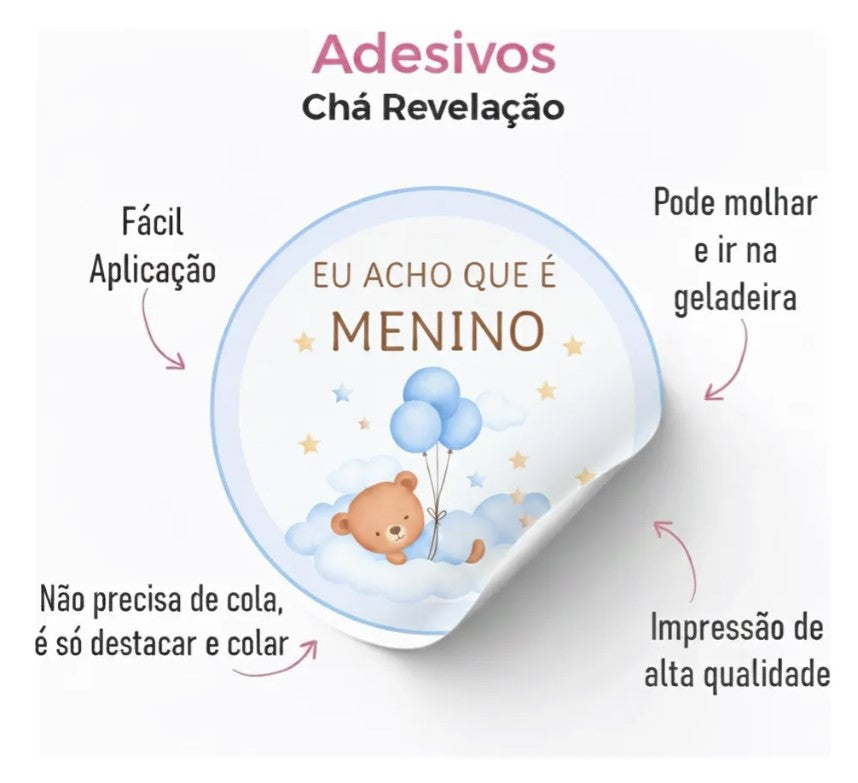 A arte desse anuncio é FIXA, apenas de acordo com o que esta na foto de capa do anuncio. Características: Adesivos Chá Revelação Adesivos 4x4 cm