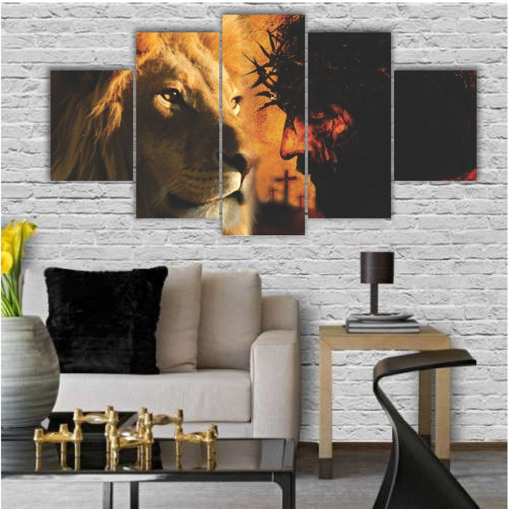Quadros Decorativos Mosaico MDF Leão Judá Cristo + Cruz Centro 115x60cm